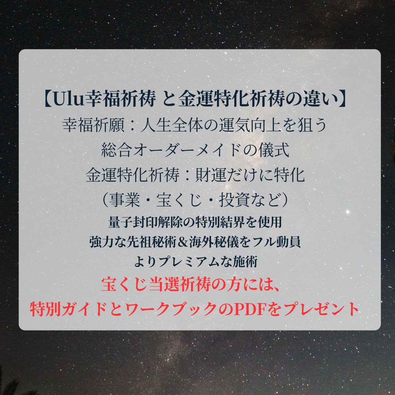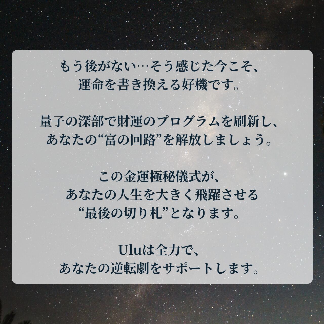 私Uluが量子レベルの奥義を駆使し、あなたの富の回路を解放し、奇跡と呼べる飛躍へと導きます。